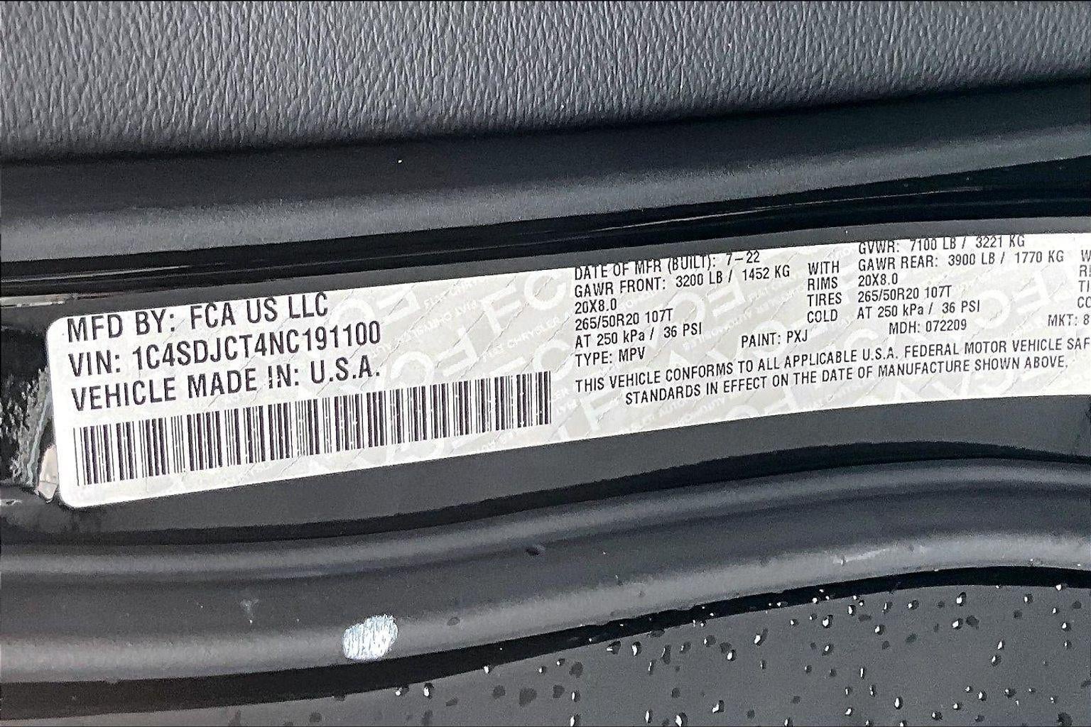 ENGINE: 5.7L V8 HEMI MDS VVT, TRANSMISSION: 8-SPEED AUTOMATIC (8HP70), QUICK ORDER PACKAGE 22S R/T, WHEELS: 20"" X 8.0"" BLACK NOISE ALUMINUM, TIRES: 265/50R20 BSW AS LRR, DB BLACK CLEARCOAT, BLACK, LEATHER SUEDE BUCKET SEATS, TRAILER TOW GROUP IV, BLACKTOP PACKAGE, POWER SUNROOF, 2ND ROW FOLD/TUMBLE CAPTAIN CHAIRS